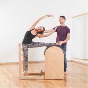 2.척추를 길게 유지하며 한 다리를 바렐 위로 올려둡니다.